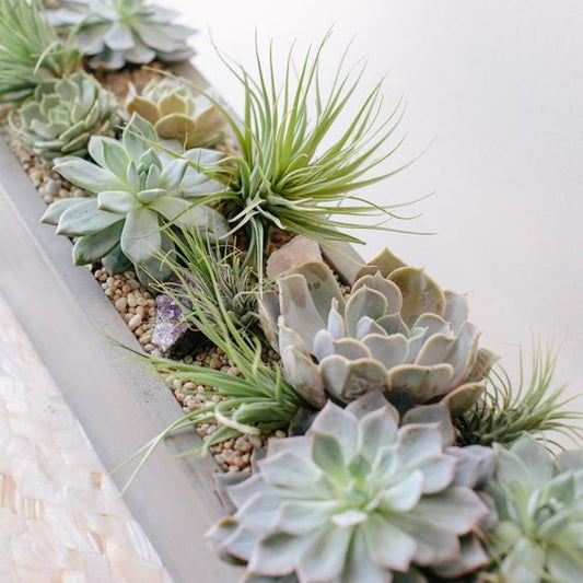 Modern live succulent arrangements in contemporary container, decorative moss and rocks. Perfect for gift giving in this holiday season